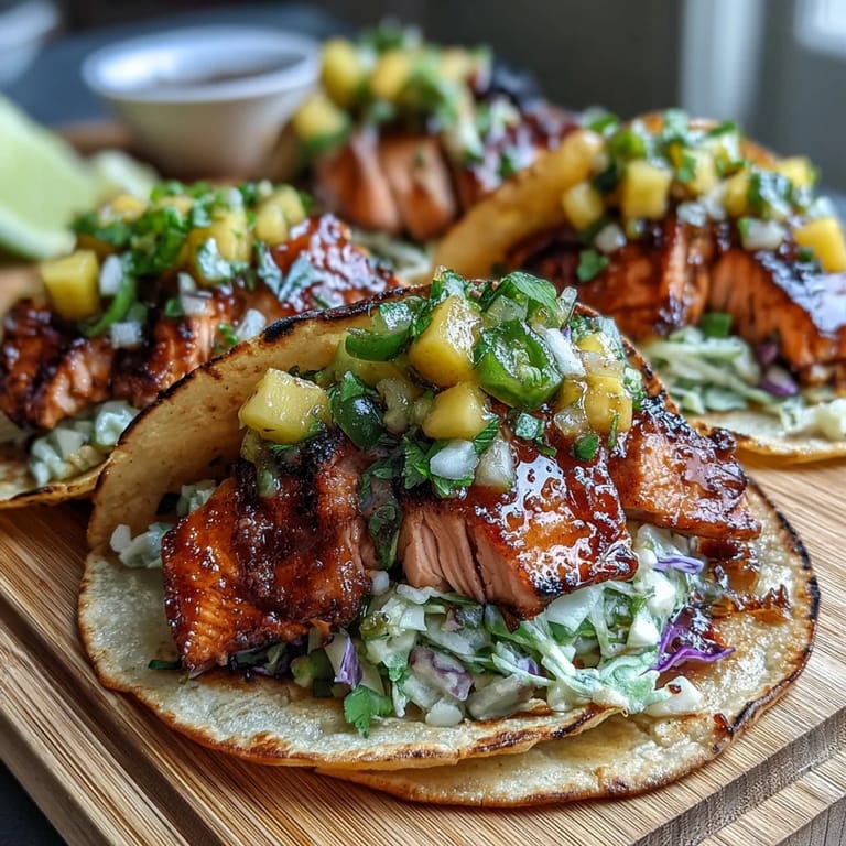 Save The scent of mango and charred salmon filled my kitchen the first time I tried making these tacos after a sunny afternoon spent at the farmer&aposs market. I remember being surprised by how quickly everything came together, especially with freshly bought ingredients laid out on the counter—colorful and inviting. It was one of those evenings where I was craving something bright but substantial, and the idea of grilled salmon with a fruity, spicy salsa felt just right. The sizzle as the fish hit the grill was almost as satisfying as the first bite. That lively burst of citrus and sweetness still brings back the memory of summer energy in every mouthful.